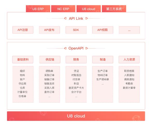 U8 cloud OpenAPI是基于用友U8 cloud企业用户和U8 cloud的开放接口,接入外部合作伙伴,为企业用户提供丰富应用和完善服务的开放平台。平台采用“云+端”的形式满足企业用户实现云ERP和云服务对接的要求
